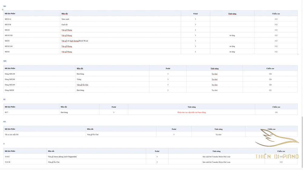 Danh sách Piano Yamaha series U U1 Mã Sản Phẩm Màu sắc Pedal Chiều cao U1 số seri dưới 100.000 Đen bóng 2 121 U1B,C Đen,Vân Gỗ 2 121 U1D Đen/Vân gỗ óc chó/Úc(Queensland)/ Vân gỗ Xoan Đào 2 121 U1E Đen /Vân gỗ óc chó Úc(Queensland)/ Vân gỗ Xoan Đào 3 121 U1F Đen […]